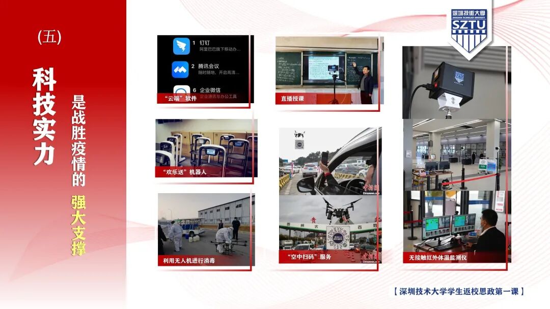 科技实力是战胜疫情的强大支撑。腾讯“云课堂”、“欢乐送”机器人、深技大“无接触红外体温检测仪”……大量“硬核科技”产品的出现和推广应用,成为我们国家最终战胜疫情的支撑力量。