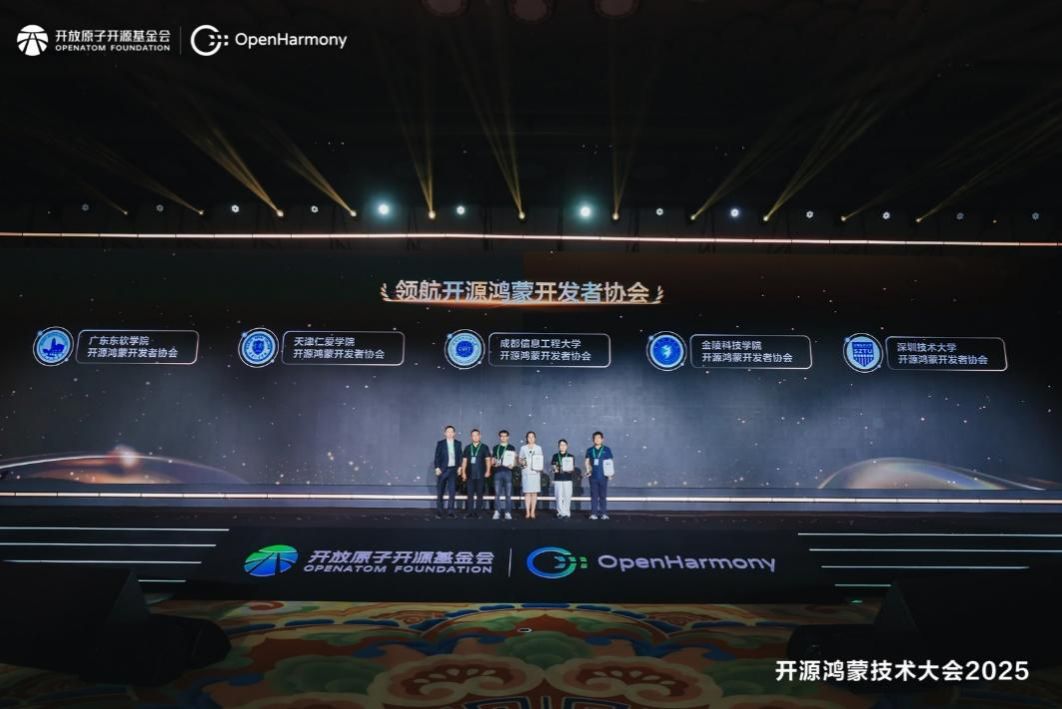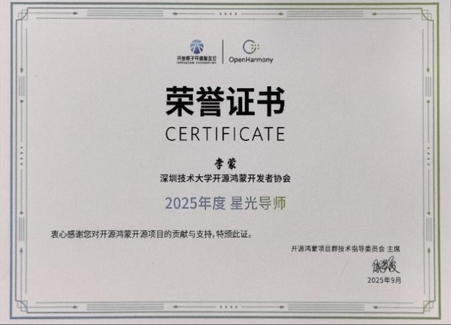 大会围绕 “协同创新、人才技术筑基、致谢授牌” 三大核心方向,对开源鸿蒙生态建设中表现突出的组织与个人进行表彰。深圳技术大学开源鸿蒙开发者协会获“领航开源鸿蒙开发者协会”称号,李蒙获“开发者协会星光导师”称号。