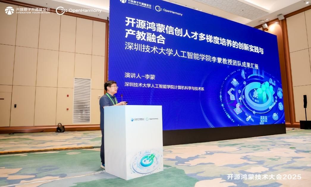 深圳技术大学人工智能学院开源创客协会负责人、开源国产操作系统实验室联合主任李蒙教授作为高校代表在大会上作主题分享,以《开源鸿蒙信创人才多梯度培养的创新实践与产教融合》为题,系统阐述了深圳技术大学基于开源鸿蒙的教学实践成果、技术研究进展及人才培养路径,生动诠释了开源鸿蒙的产业价值与生态共建模式,其分享内容为高校参与开源鸿蒙生态建设提供了有益参考。