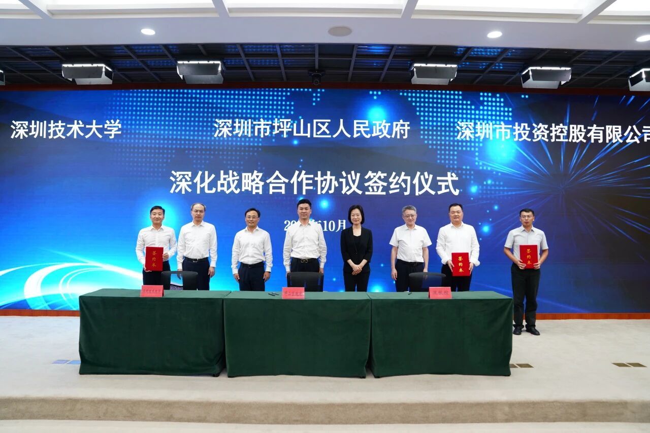 10月10日下午,深圳技术大学与坪山区、深圳市投资控股有限公司三方举行签约仪式,共筑产教融合与科技创新新生态。坪山区委书记赵嘉,区委副书记、区长张茜,区领导冷和明、杨涛;深圳市投资控股有限公司党委副书记杜秀峰、副总经理任仲泉;深技大党委书记陈秋明,副校长梁永生、邓元龙等出席仪式。