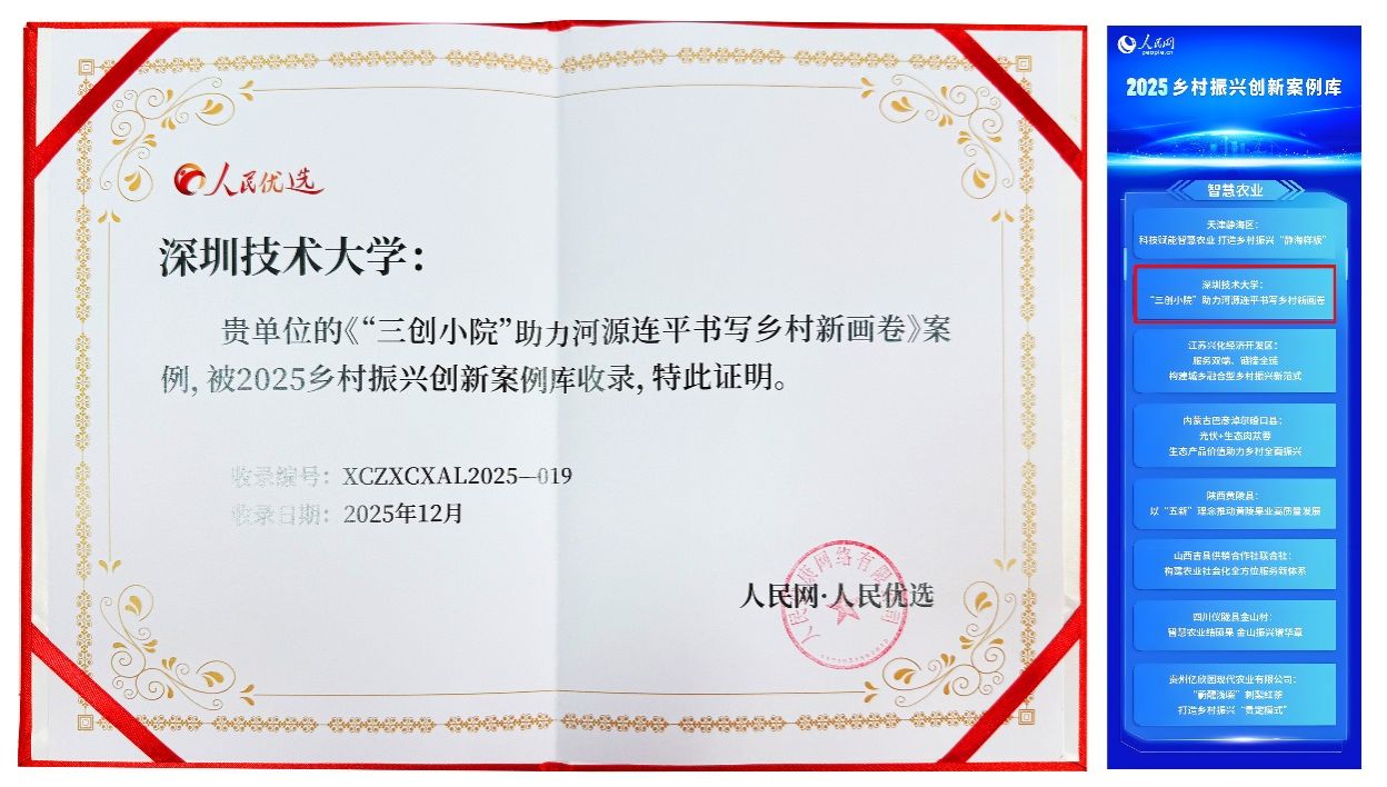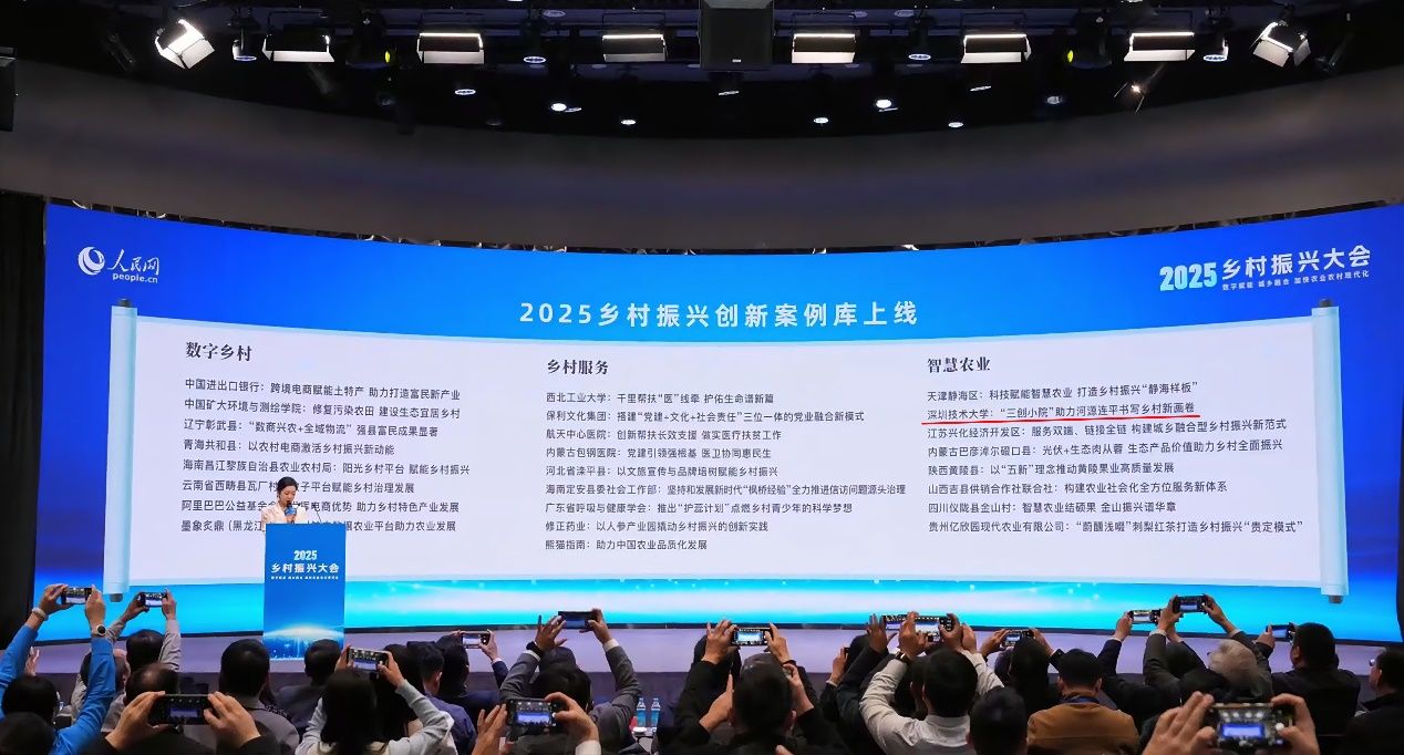 会议期间,大会重磅发布了人民网“2025乡村振兴创新案例库”,全国仅60个典型案例被收录。其中,深圳技术大学申报的《“三创小院”助力河源连平书写乡村新画卷》案例成功入选并获人民优选官方认证,成为高校帮扶地方乡村振兴的全国典型样本,这体现了国家级平台对深圳技术大学乡村振兴实践的充分肯定。本次入选该案例库的高校单位全国仅3所,深圳技术大学是华南地区唯一入选高校。