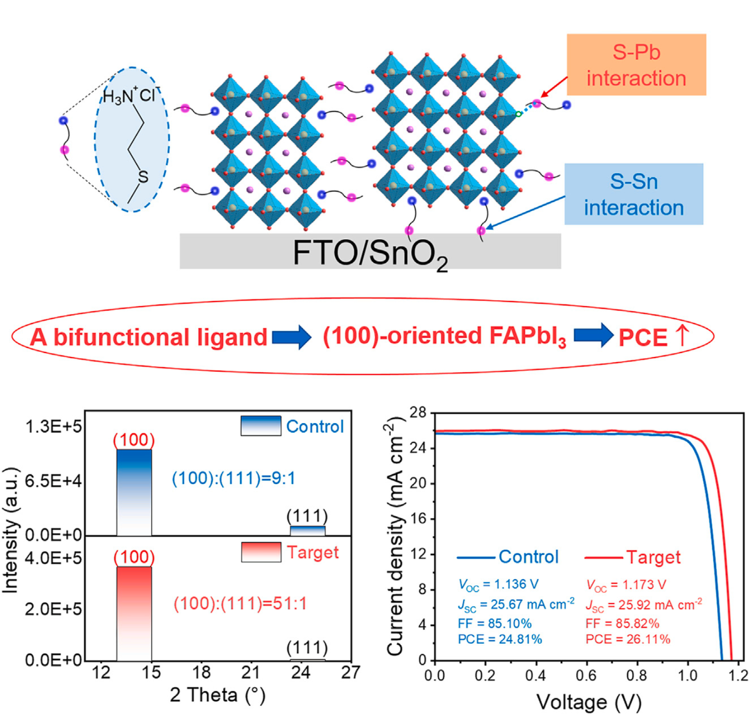 针对钙钛矿太阳能电池(PSCs)中晶体取向随机、埋底界面接触不良导致非辐射复合严重、器件效率与稳定性受限的关键难题,提出了一种双功能配体调控策略。研究团队将2-(甲硫基)乙胺盐酸盐(METEAM)引入钙钛矿前驱体溶液,其含有的-H₃N⁺头部与S含尾部可实现双重功能。核心创新点在于METEAM能优先吸附于钙钛矿(100)晶面,通过强相互作用降低表面能,诱导(100)取向结晶,使(100)与(111)晶面强度比达51:1,取向度提升至91.7%;同时自发聚集于钙钛矿与SnO₂电子传输层的埋底界面,通过S-Sn、S-Pb相互作用双向钝化缺陷,改善界面接触。由此制备的钙钛矿薄膜陷阱态密度降低、载流子寿命延长至1426 ns、迁移率提升至109.7 cm² V⁻¹ s⁻¹,基于此的传统结构PSCs器件光电转换效率达26.1%(认证25.8%),处于同类传统结构器件领先水平,且运行稳定性与环境稳定性显著提升。该研究通过配体工程同步调控晶体取向与埋底界面,为PSCs效率突破提供了简洁高效的新路径,也为其他光电子器件的界面与结晶调控提供了借鉴。