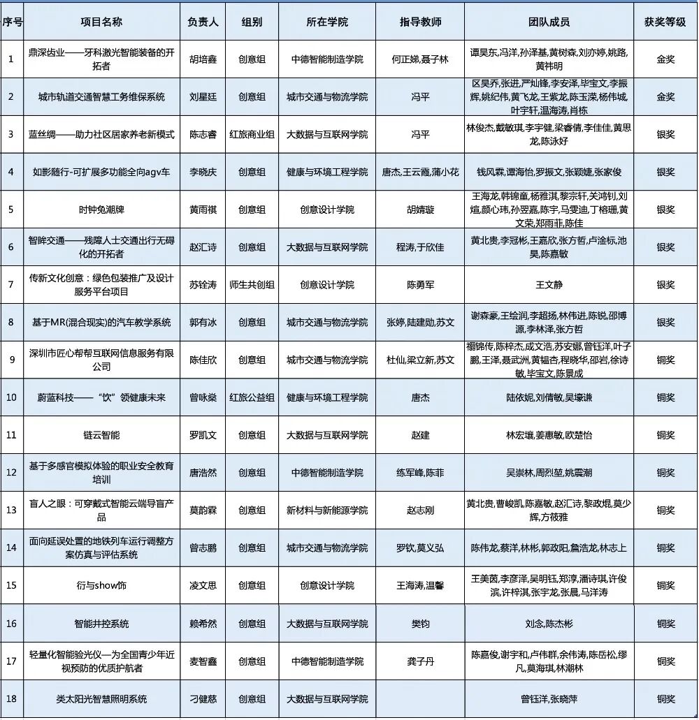 本次大赛于2020年3月启动,共收集参赛项目50个,有效参赛项目39个,其中创意组34个、师生共创组2个、红旅公益组2个、红旅商业组1个,参赛师生近300人。经学院初审、校赛网评、决赛路演、金奖争夺赛,共评选出“鼎深齿业——牙科激光智能装备的开拓者”等18个获奖项目。具体获奖名单如下: