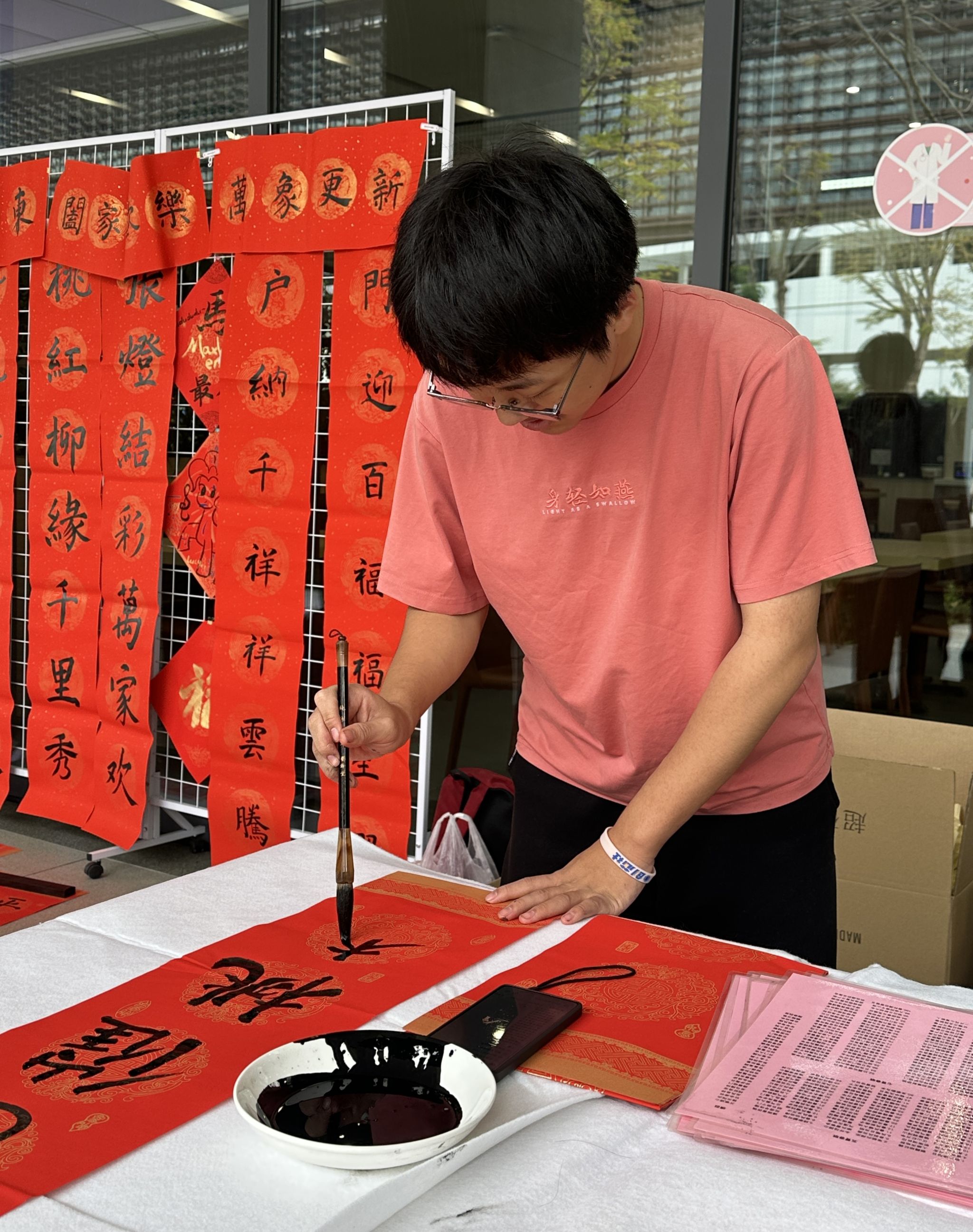 活动现场,红纸铺展,墨香四溢。校书法协会骨干成员及学生志愿者挥毫泼墨,笔走龙蛇,将新春的祝福凝聚于一笔一画之间。教职工们或驻足欣赏,或精心挑选心仪的联句,也可提供自撰内容请志愿者书写。现场还设置了DIY创作区,提供笔墨纸砚等材料,教职工可亲手书写春联和“福”字。一副副寓意吉祥的春联、一张张饱满圆润的“福”字在笔下诞生,红艳艳的春联映照着人们喜悦的笑脸。