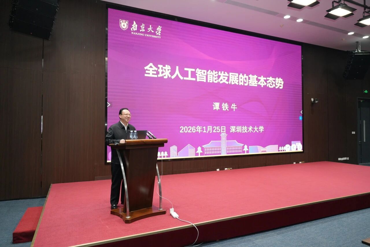 1月25日下午,南京大学党委书记、中国科学院院士谭铁牛应邀来访深圳技术大学,以“全球人工智能发展的基本态势”为题作专题报告。深圳技术大学党委书记陈秋明主持报告会,党委委员、副校长明仲,学校各专业教师代表及研究生、本科生等160余人聆听报告。