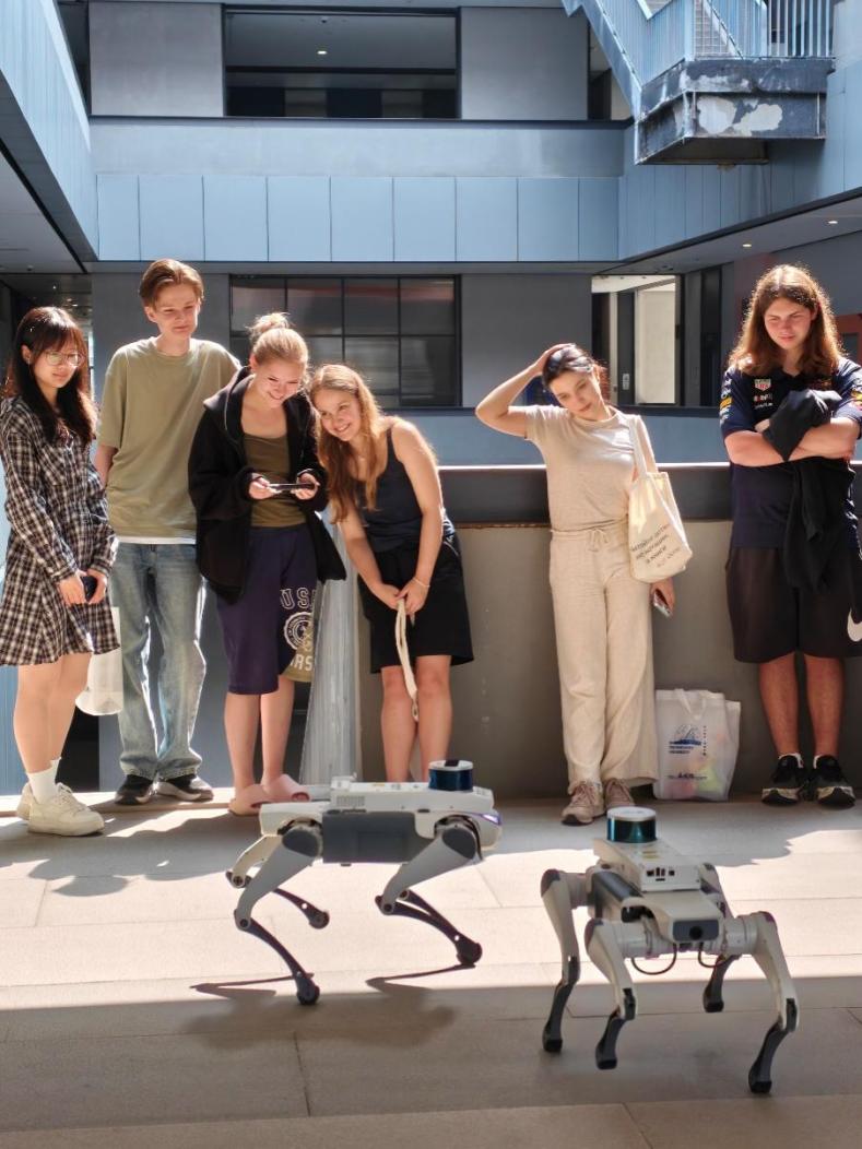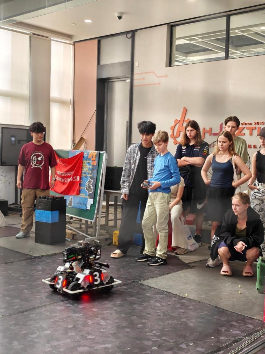 科技无国界,创新共未来。本次活动除了开设编程课程教授基础逻辑与算法思维,还构建了“实验室+工作室+名企”的实践教学体系。在校内,机器人实验室成为了最热门的“打卡地”。当四足机器狗在指令下灵活行走、翻滚时,俄罗斯学生们眼中闪烁着好奇与兴奋的光芒,他们围拢上前,亲手操作设备,这种“看得见、摸得着”的科技体验,远比书本上的公式更具感染力。