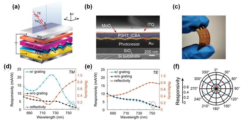 图(a)偏振光探测器结构示意图;图(b)探测器的SEM剖面图;(c)柔性偏振光电探测器实物图;图(b-c)探测器对TM和TE偏振光的响应度;图(f)探测器响应度与入射偏振角度的变化关系。