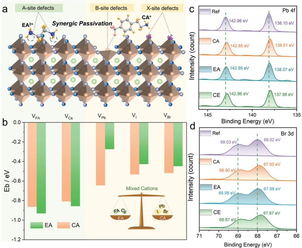 针对钙钛矿/有机叠层太阳能电池(POTSCs)中宽带隙钙钛矿子电池缺陷类型多、非辐射复合严重,导致开路电压(Voc)损失大、器件效率受限的关键难题,提出了一种混合阳离子表面调控策略。研究团队采用4-三氟苯乙胺阳离子(CA⁺)与乙二胺阳离子(EA²⁺)组成混合钝化体系(CE),利用二者的协同互补效应实现缺陷全方位钝化。核心创新点在于CA⁺擅长钝化铅与卤素相关缺陷,EA²⁺对甲脒(FA)和铯(Cs)相关缺陷钝化效果显著,二者结合可全面降低电子与空穴陷阱密度,使非辐射复合速率从0.80 ns⁻¹降至0.11 ns⁻¹。基于此,1.85 eV宽带隙钙钛矿电池实现1.35 V的创纪录Voc和83.29%的高填充因子,与四元有机异质结结合制备的POTSCs,光电转换效率达24.47%。同时,未封装器件在最大功率点跟踪或60℃热老化500 h后仍保持90%以上初始效率,稳定性优异。该研究为宽带隙钙钛矿的缺陷调控提供了新思路,证实了混合阳离子钝化体系的协同优势,不仅推动POTSCs效率与稳定性的双重突破,也为其他钙钛矿基光电子器件的性能优化提供了重要参考。