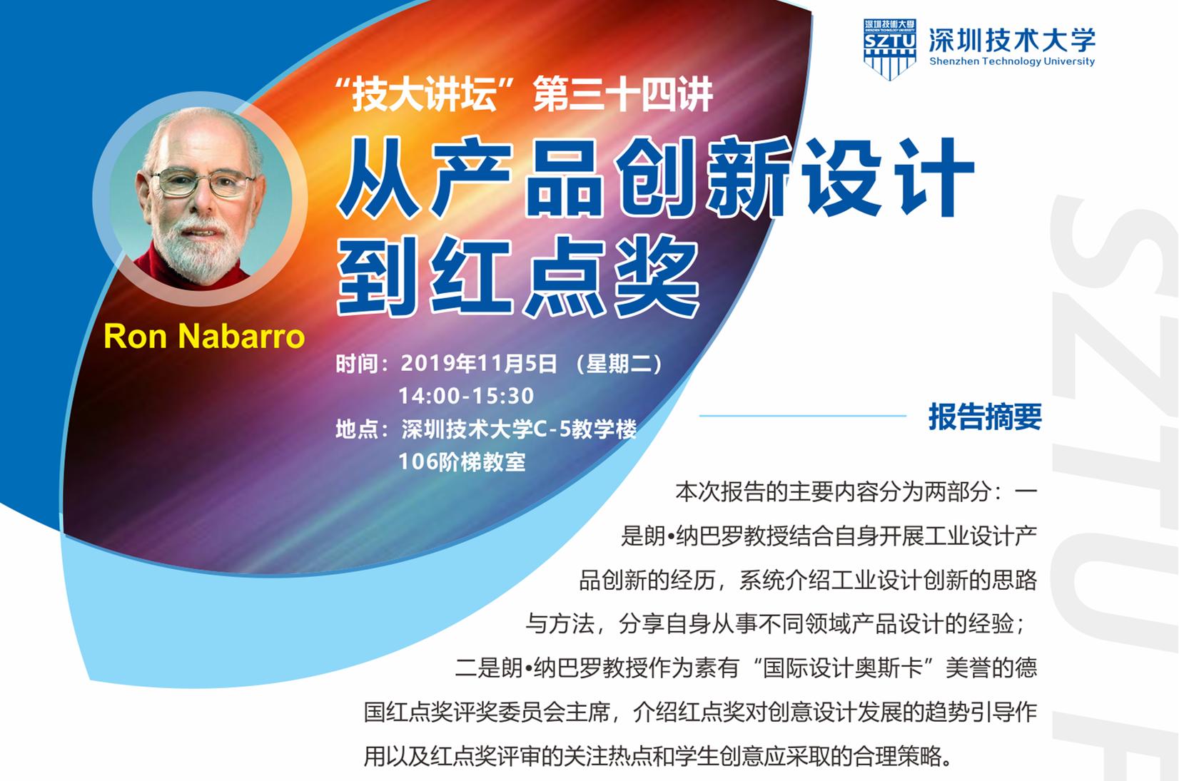 时间:2019年11月5日(星期二)14:00-15:30地点:深圳技术大学C-5教学楼106阶梯教室主题:从产品创新设计到红点奖报告摘要本次报告的主要内容分为两部分:一是朗•纳巴罗教授结合自身开展工业设计产品创新的经历,系统介绍工业设计创新的思路与方法,分享自身从事不同领域产品设计的经验;二是朗•纳巴罗教授作为素有“国际设计奥斯卡”美誉的德国红点奖评奖委员会主席,介绍红点奖对创意设计发展的趋势引导作用以及红点奖评...